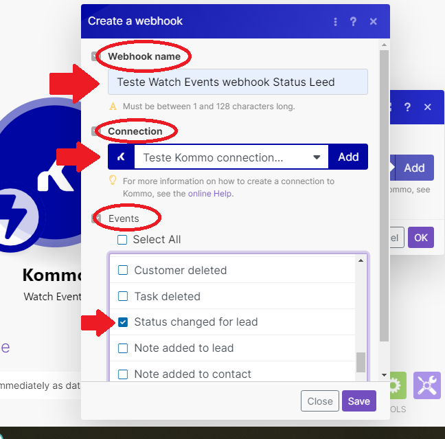 Em Webhook name, coloque o nome relacionado ao evento que será escutado no Kommo CRM.
