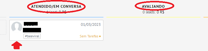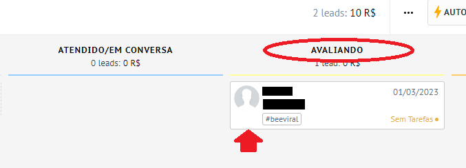 Vamos pegar Lead que está em Atendido/Em conversa e vamos passar para Avaliando como exemplo.