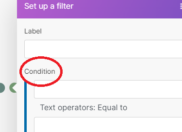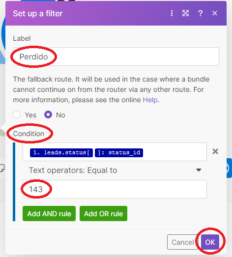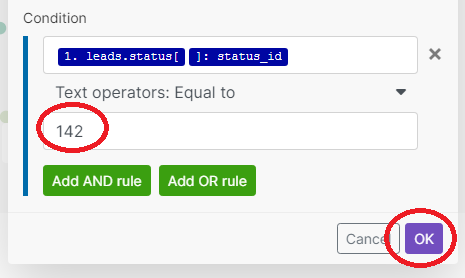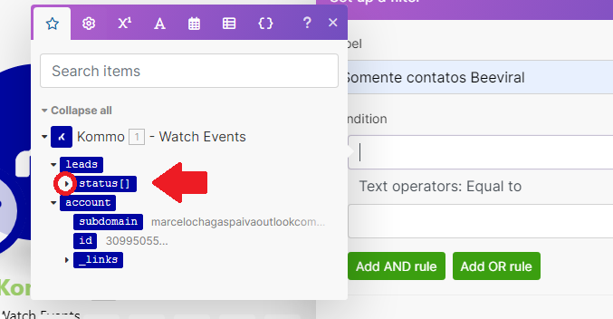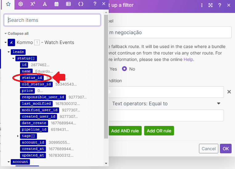 Agora volte na configuração do filtro e no campo abaixo do Text operators cole o número do status_id.