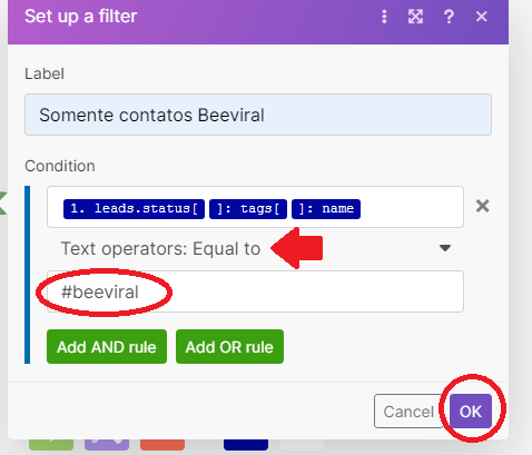 Obs: Essa configuração é para retornar apenas os clientes que tiverem #beeviral.