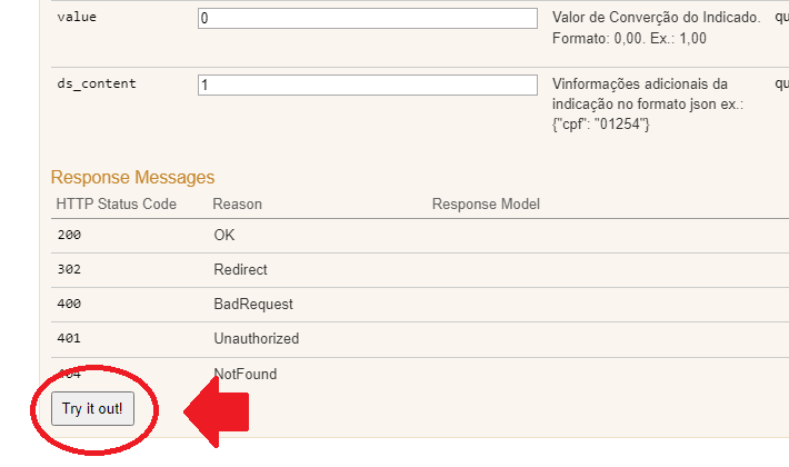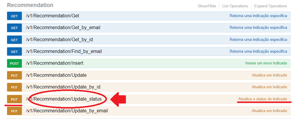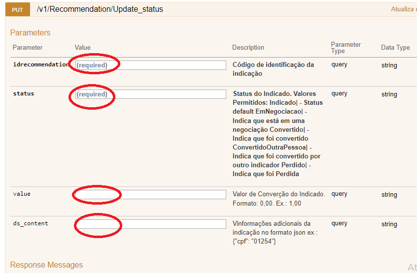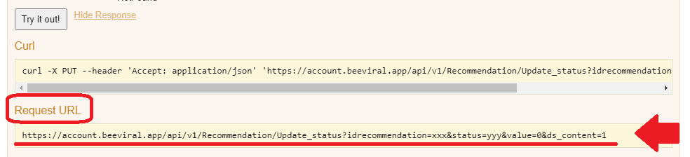 Preencha qualquer valor nos campos: idrecommendation, status, value e ds_content para poder pegar a Request URL.