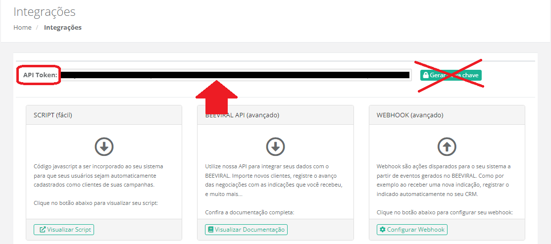 Copie a chave que está no campo API Token.Obs: Não clique em nehuma hipótese em: Gerar nova chave.