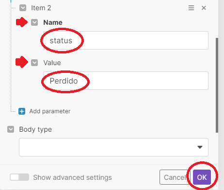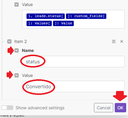 No Item 1 nos campos Name e Value, serão colocadas as mesmas informações o Convertido.